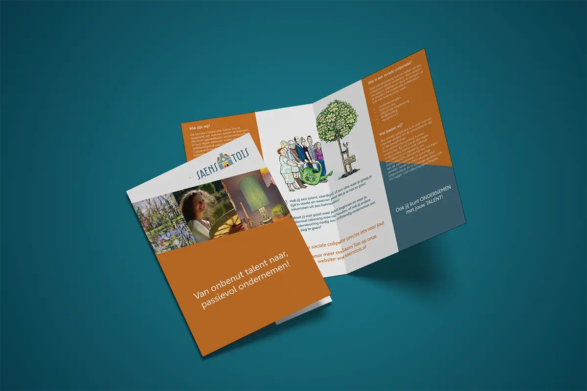 Voor Saens Tois ontwierp ik een A5-folder die wordt gebruikt voor promotiedoeleinden. De flyer moest volledig aansluiten bij de huisstijl van het bedrijf.